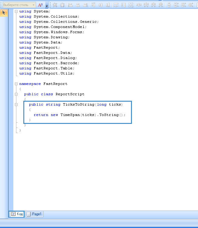 Для представления числа в виде временного интервала на макете Fast Report на вкладке Макет отчета -> Код нужно дописать функцию: