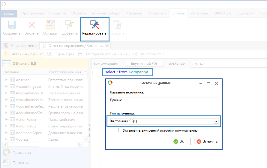 1. На верхней панели выбираем пункт Редактировать и указываем Тип источника – Внутренний (SQL).