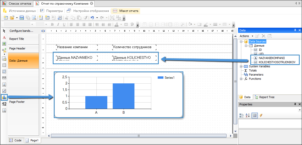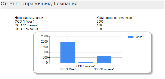 Сохраняем и публикуем отчет. В результате получим простейший отчет, содержащий данные справочника Компания и диаграмму по этим данным.