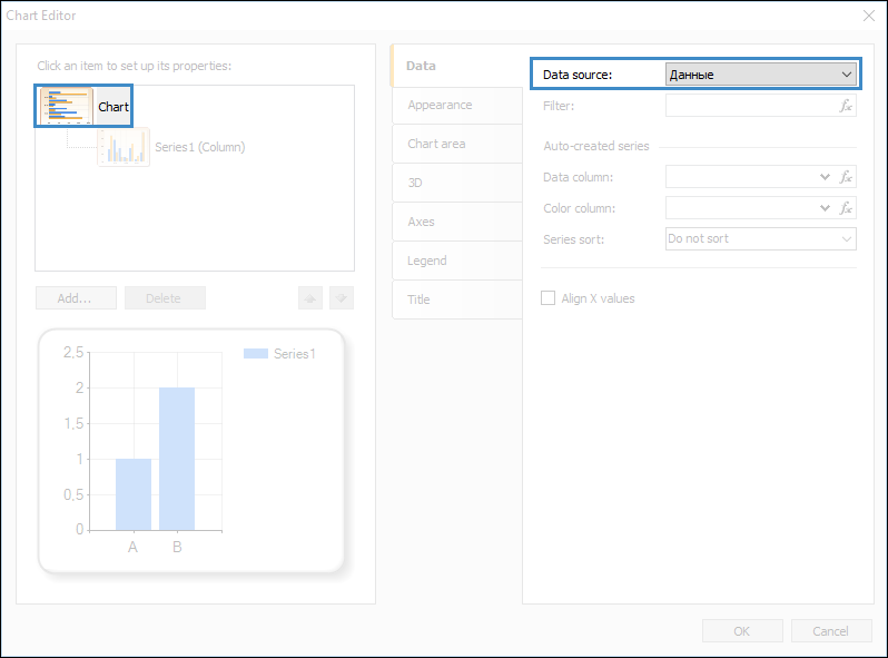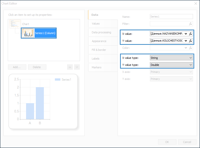 7. В настройках серии указываем нужные нам данные по оси X и по оси Y. При необходимости указываем их тип.