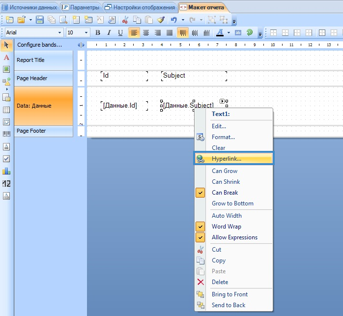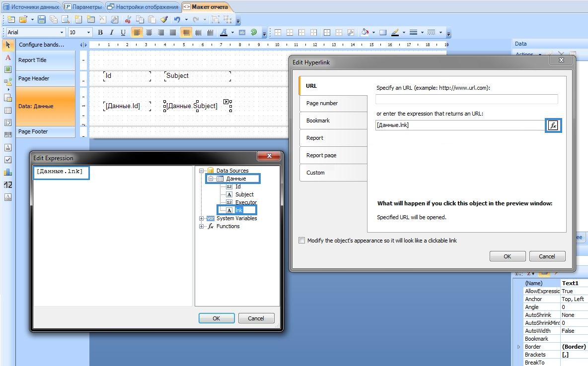select tb.Subject, tb.Executor, tb.Id, (cast(’http://127.0.0.1:8000/Workflow/WorkflowTask/Execute/’ as varchar(100)) + cast(tb.Id as varchar(100))) as lnk from TaskBase as tbФрагмент ссылки ’http://127.0.0.1:8000/Workflow/WorkflowTask/Execute/’ является одинаковым для всех задач, после этого необходимо дописать Id задачи, приведя его к строковому типу: cast(tb.Id as varchar(100)). Сложение этих двух строковых значений в итоге даст нужную ссылку. Добавить ее на макет отчета можно, вызвав контекстное меню для нужного поля (в данном случае Subject) и выбрав пункт меню Hyperlink. Далее необходимо указать выражение, возвращающее ссылку, как показано на рисунке.rsquo;http://127.0.0.1:8000/Workflow/WorkflowTask/Execute/ Фрагмент ссылки &