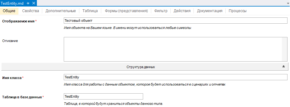 Описание типа объекта хранится в файле с расширением *.md. Тип объекта является наследником класса EleWise.ELMA.Model.Entities.Entity, где T - тип идентификатора объекта. Редактор для ELMA Entity визуально аналогичен карточке объекта в дизайнере. В Visual Studio редактор сущности TestEntity выглядит следующим образом: