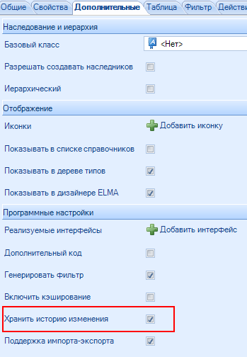 Для начала необходимо настроить сущность в Дизайнере. Для этого откройте ее карточку и на вкладке Дополнительные установите флажок Хранить историю изменения, как показано на рисунке: