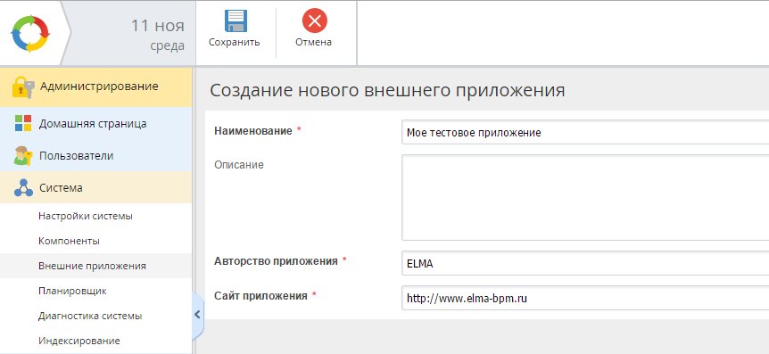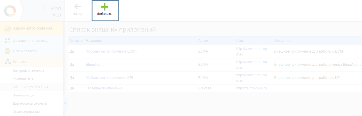 Создадим внешнее приложение и токен для него. Для этого нужно перейти в раздел Администрирование – Система – Внешнее приложения и нажать на кнопку Добавить.