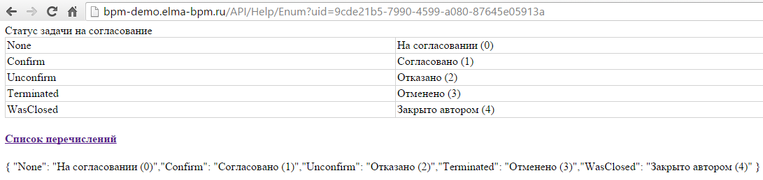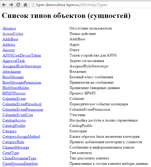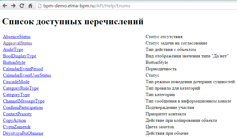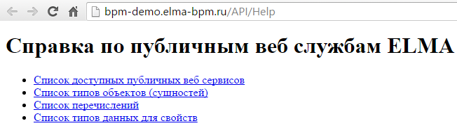Существует автогенерируемая справка по WebAPI. В ней содержится информация о том, какие есть доступные сервисы, объекты, перечисления и типы данных для свойств. Она расположена по относительной ссылке ~/API/Help (например http://bpm-demo.elma-bpm.ru/API/Help). В этой справке можно найти описание всех доступных сервисов (как корневых, так и функциональных) и их методов.