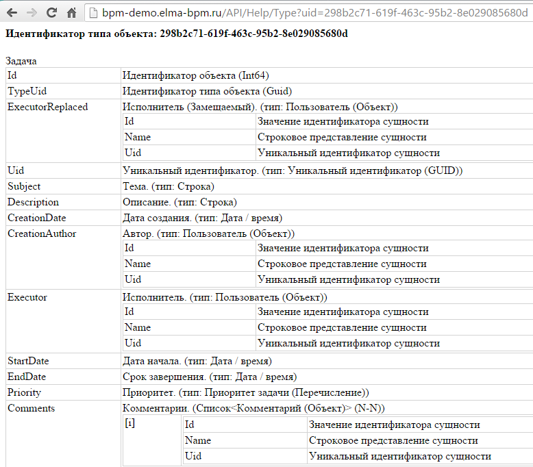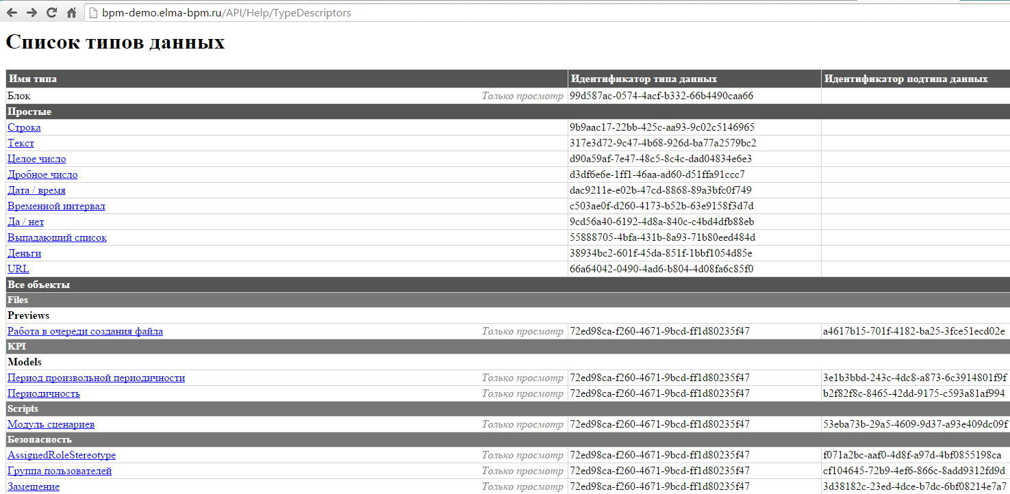 1. Идентификатор типа данных – это уникальный идентификатор категории объекта. Для стандартных .Net объектов он всегда разный. Для объектов системы ELMA может повторяется. Ниже приведён список основных категорий и их идентификаторов: