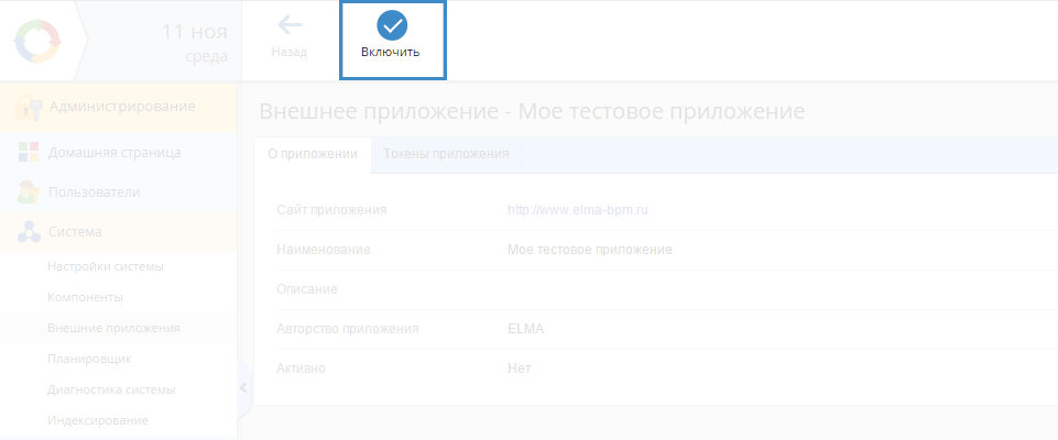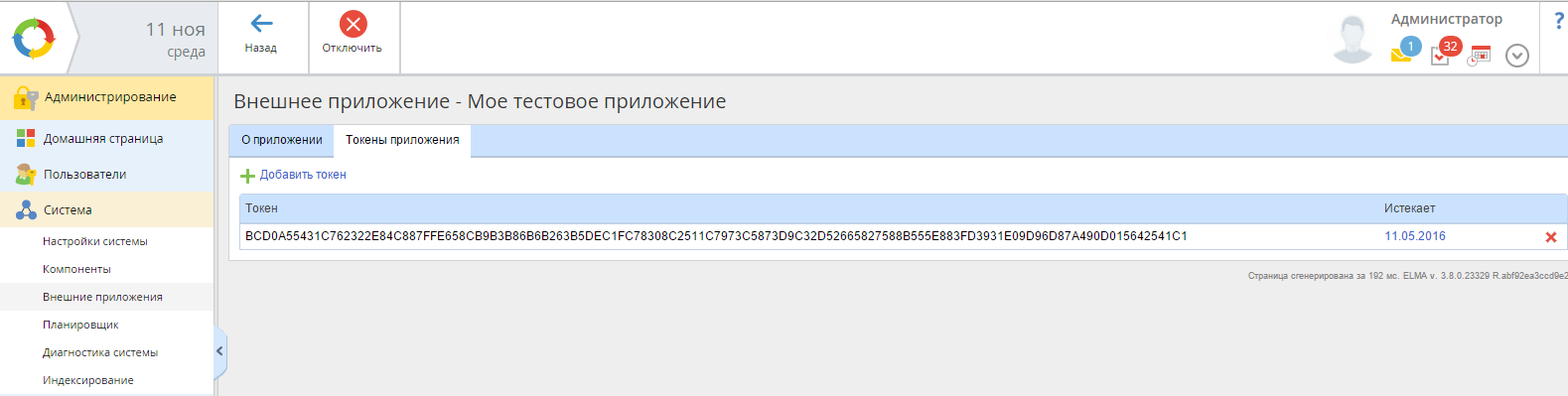 Настройки токенов внешних приложений осуществляются в разделе Администрирование, при этом есть ряд системных токенов, срок истечения которых устанавливается отдельно для каждого приложения.