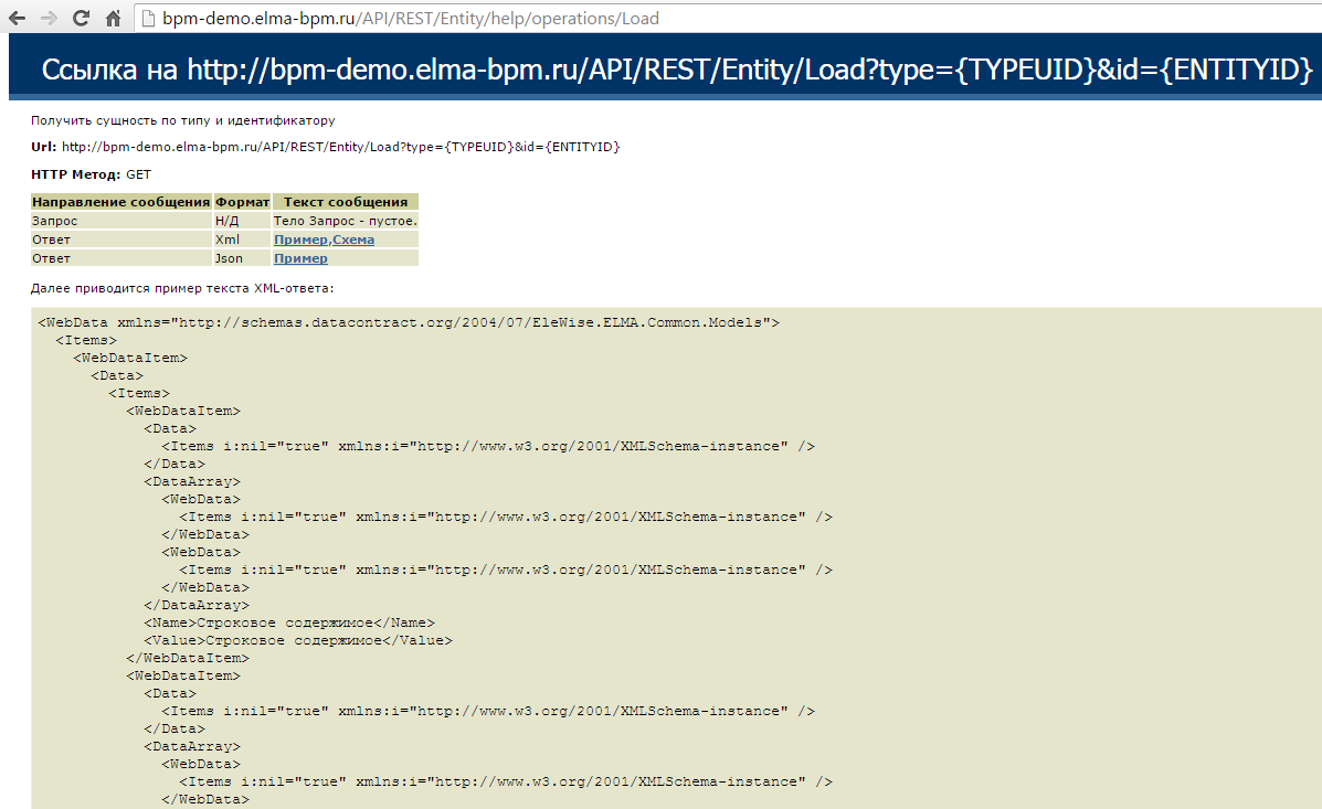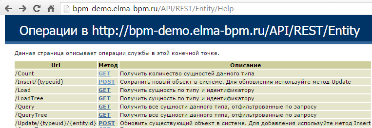- Также для WCF HTTP формируется стандартная справка формата .NET WCF, она доступна по адресу ~/API/REST/<Имя сервиса>/Help , для AuthorizationService это будет ~/API/REST/Authorization/Help (например, http://bpm-demo.elma-bpm.ru/API/REST/Authorization/help).