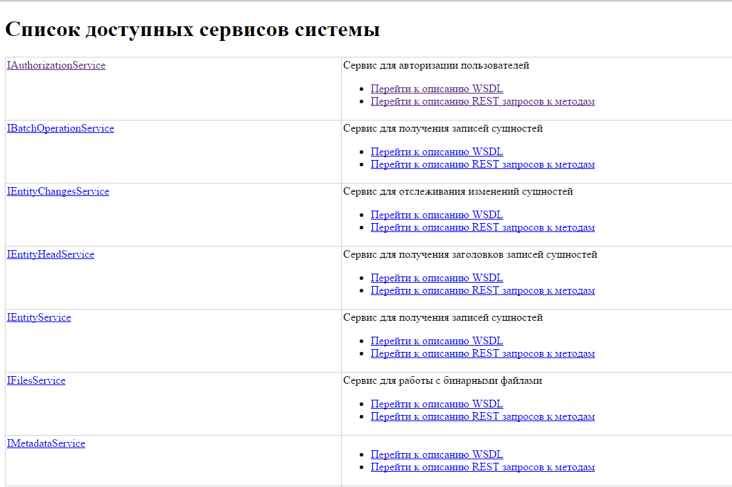 Содержит информацию о том, какие веб-сервисы системы доступны для вызова сторонним приложениям.