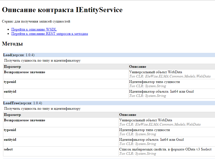 Каждый из веб-сервисов содержит информацию о методах, которые можно вызвать из данного веб-сервиса, а также о параметрах метода и возвращаемом значении.