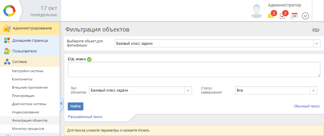 В системе у всех фильтров формируется текстовое поле Query, в который можно записать условие выборки. Чтобы проверить условие выборки на корректность и увидеть сразу результат, в версии 3.9+ Вы можете выполнить его в специальном разделе в Администрировании – Система – Фильтрация объектов. Для этого Вам необходимо выбрать тип объекта, выбрать EQL-поиск и написать условие выборки:
