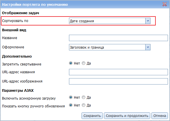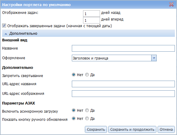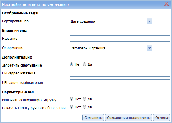 Администратор может установить значения настроек портлета по умолчанию, эти значения будут использованы при добавлении нового портлета на страницу. Например, в настройках по умолчанию для какого-то портлета можно включить асинхронную загрузку.