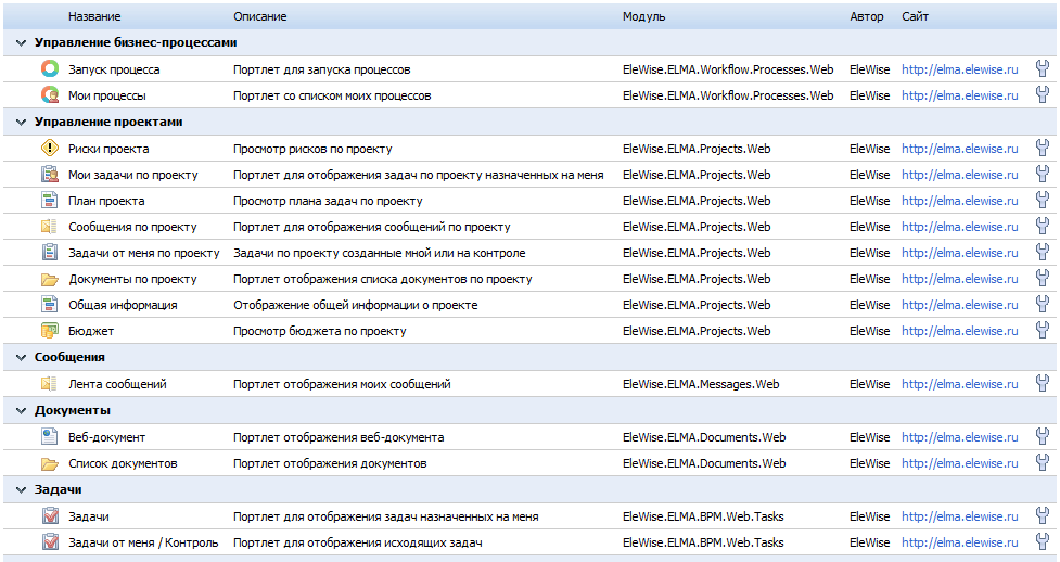 PortletManager – логика работы портлетов реализована в классе EleWise.ELMA.Web.Mvc.Portlets.PortletManager, с его помощью можно переиспользовать портлетную систему, что и сделано в модуле Управление проектами.