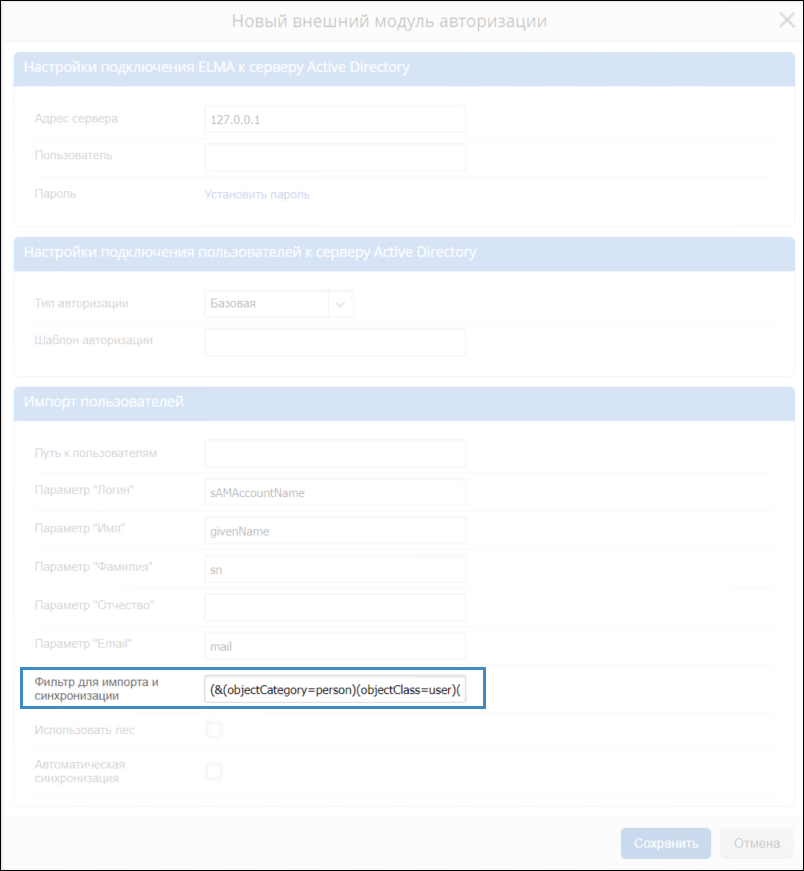 Рис. 1. Диалоговое окно "Новый внешний модуль авторизации". Блок "Импорт пользователей". Поле "Фильтр для импорта и сихронизации"