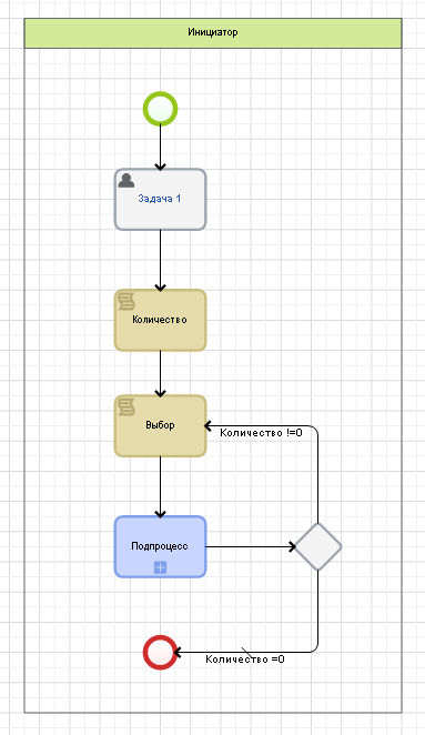 5. Поставить условие проверки окончания блока. Для этого можно поставить Исключающий ИЛИ-Шлюз, на переходах которого проверять переменную Количество: если она не равна нулю, то переходим на второй сценарий, где будет выбран следующий элемент. Если Количество равно 0, то уходим в конец процесса.
