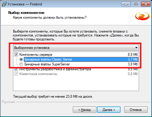 Установка производится при помощи мастера (в случае, если вы загрузили installer версию). По умолчанию в мастере установки выбран SuperServer. Установите переключатель в положение Classic Server: