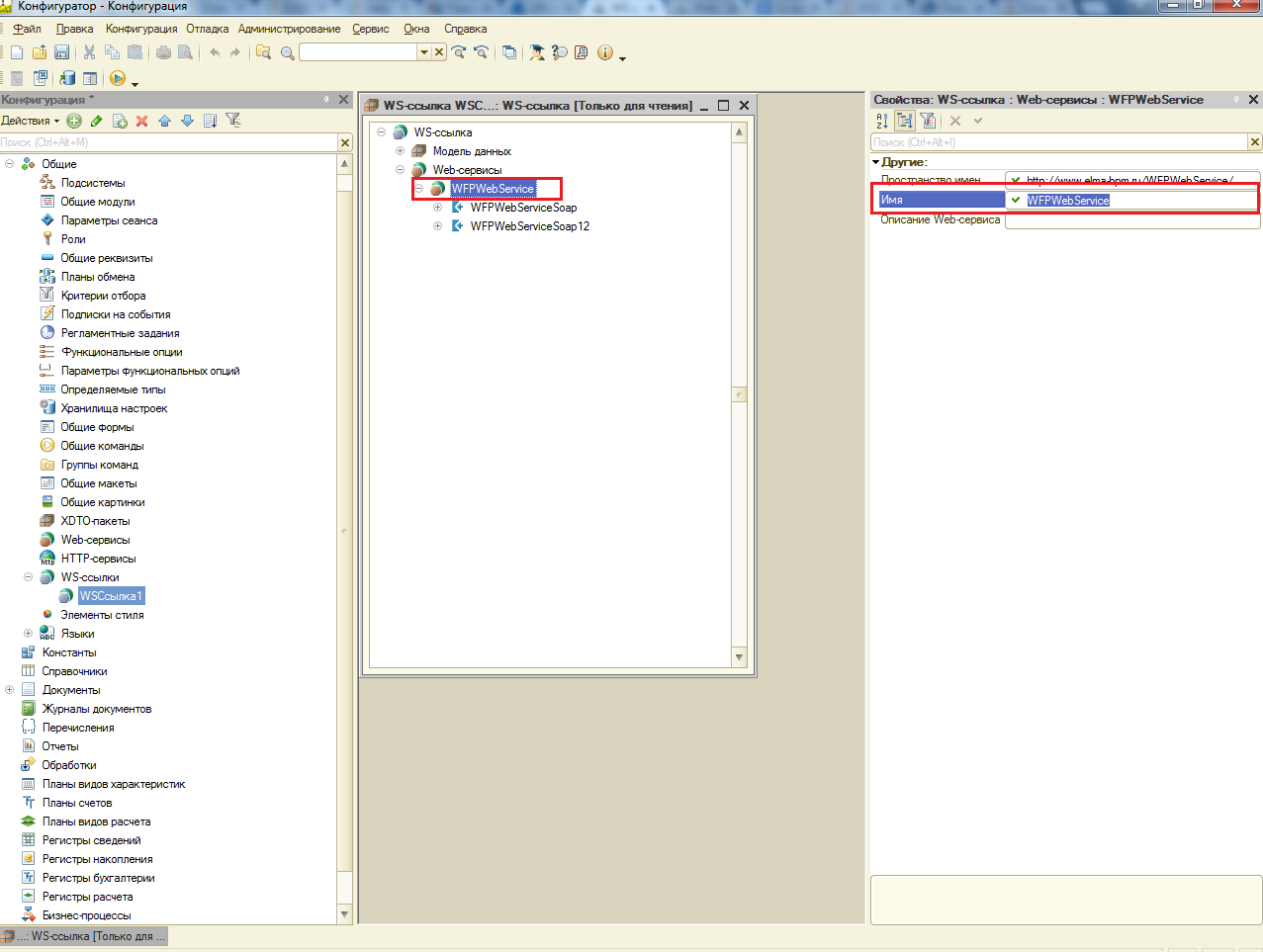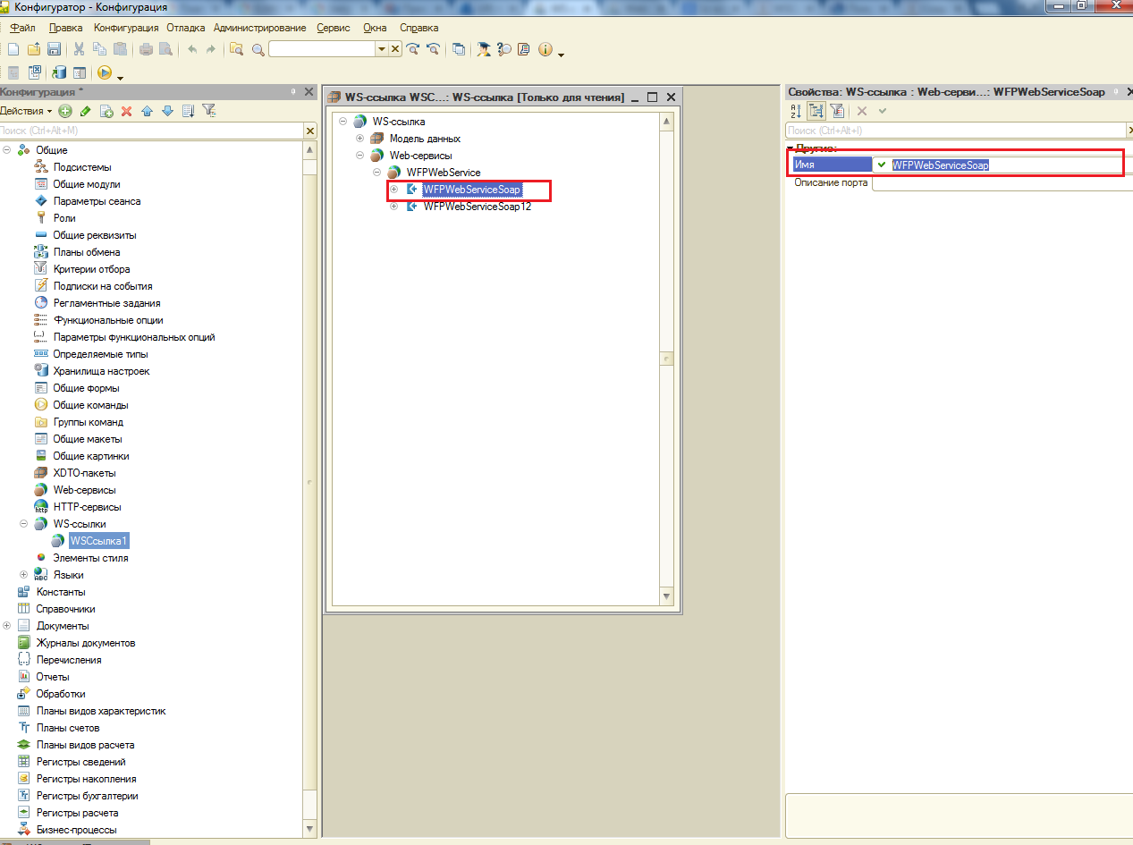 - Далее предается Наименование Порта, оно указано в разделе WS-ссылка − Web-сервисы − WFPWebService. В примере наименованием порта является WFPWebServiceSoap.