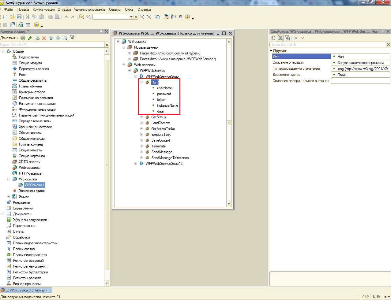 3. Затем открыть в конфигураторе файл созданной внешней обработки и проверить, правильно ли указано имя WS-ссылки, путь до файла конфигурации, а также правильно ли указаны входные переменные для метода Run.