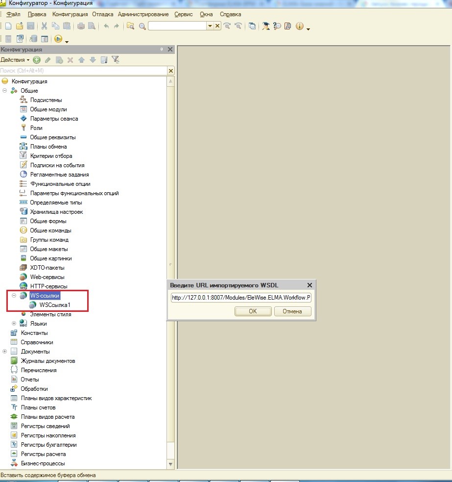 1. В 1С 8.2 открыть в конфигураторе дерево метаданных нужной конфигурации, зайти в раздел Общие - WS-ссылки, нажать кнопку Добавить и в появившееся окно вставить адрес WS-ссылки.