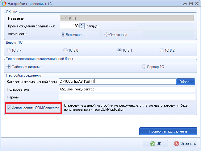 Для использования COMConnector необходимо поставить флажок Использовать COMConnector в окне настройки соединения с 1С.
