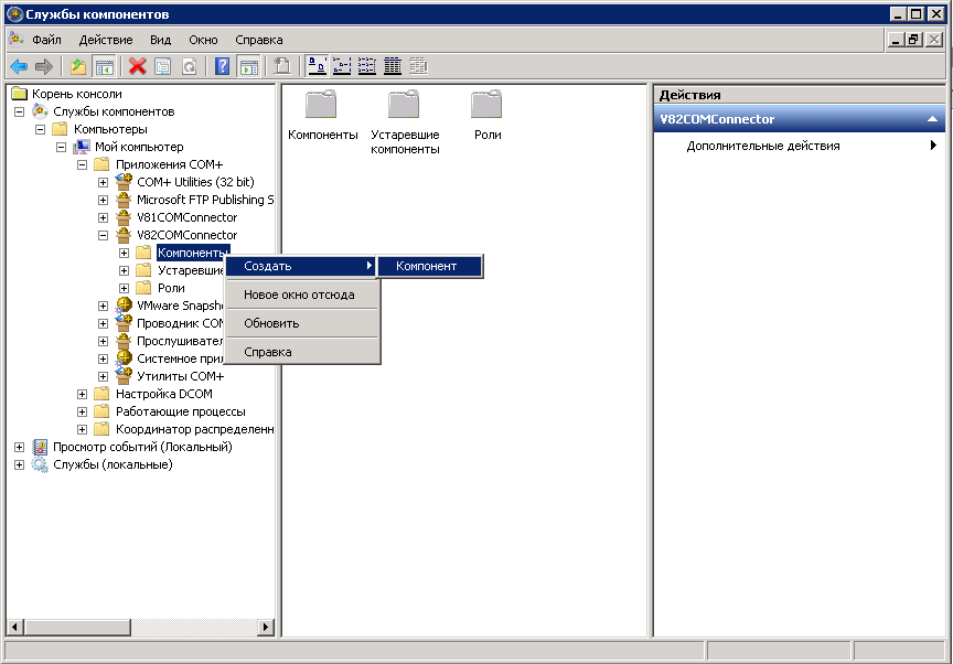 4. Создать новый компонент, нажав правой кнопкой на созданном приложении V82COMConnector