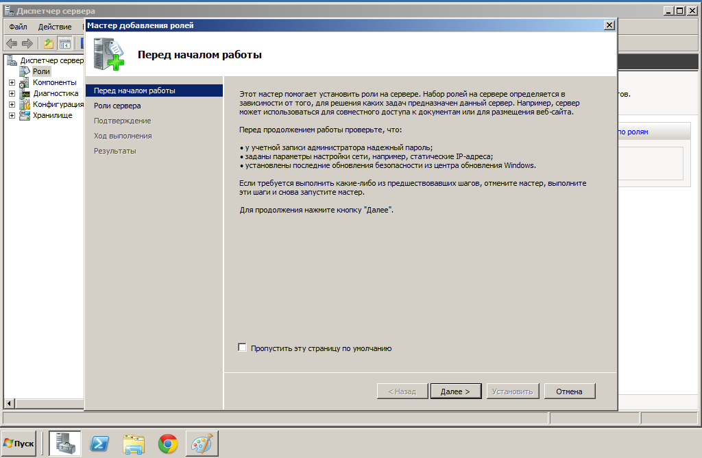 2. В открывшемся окне необходимо выбрать пункт 2 Добавить роли и компоненты. Запустится Мастер добавления ролей. Для продолжения необходимо нажать на кнопку Далее.
