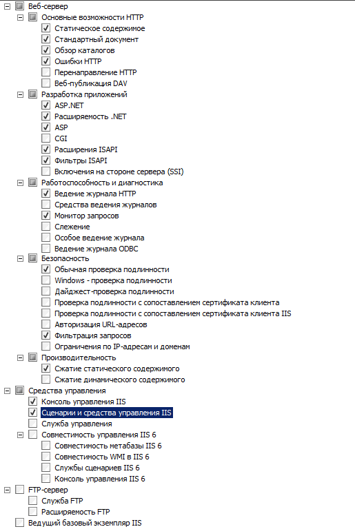 Следует отметить, что настройку IIS также можно осуществить в интерфейсе командной строки (данный способ настройки рекомендуется использовать только опытным пользователям Windows). Подробнее об этом см. на странице Настройка IIS с помощью командной строки.