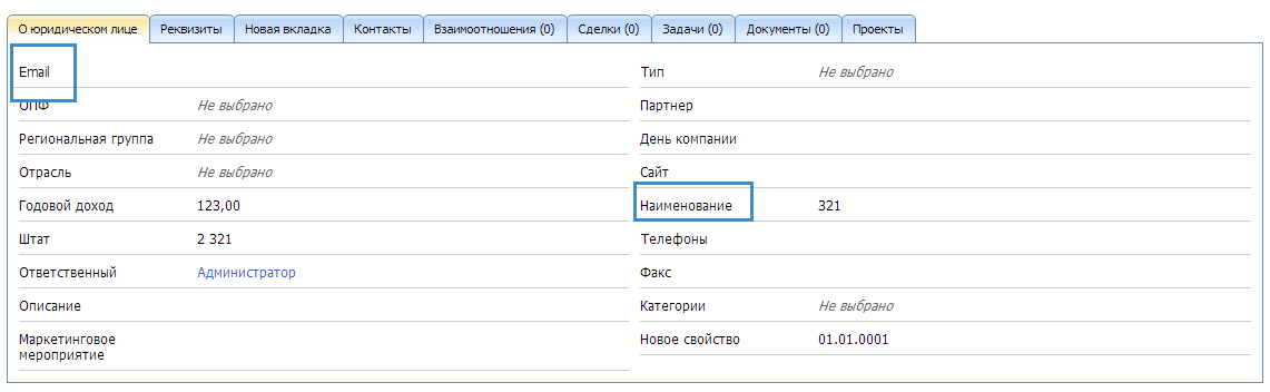 Форма просмотра карточки контрагента состоит из вкладок и свойств. Так форма выглядит по умолчанию: