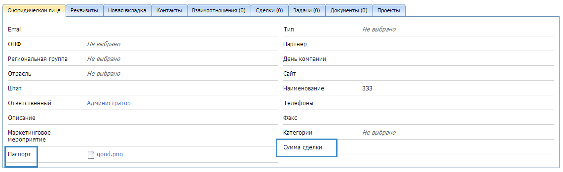 Создадим свойство Сумма сделки с типом данных Дробное число, Паспорт - с типом данных Файл. После публикации изменений и перезагрузки сервера, это свойство добавится в карточку контрагента.