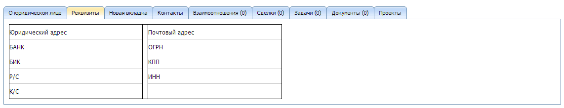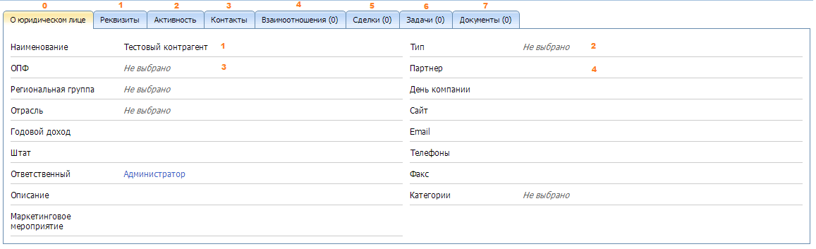 Первая вкладка (под номером 0 на первом изображении этой статьи) хранит в себе основные данные контрагента и выглядит так: