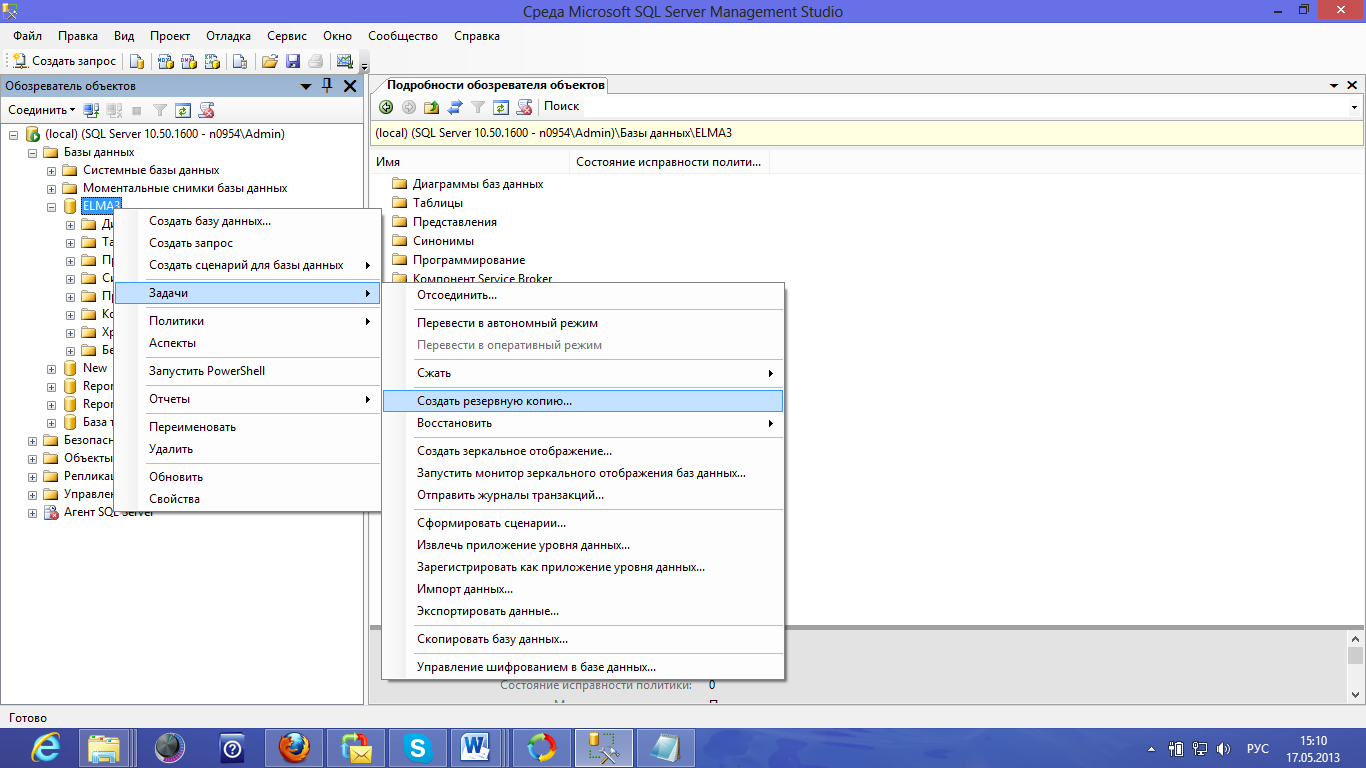 Операция резервного копирования базы данных MS SQL может быть выполнена несколькими способами. Рассмотрим вариант резервного копирования в среде SQLManagementStudio. Для этого необходимо в списке баз данных выбрать необходимую БД и в контекстном меню выбрать пункт Задачи, далее выбрать команду Создать резервную копию.