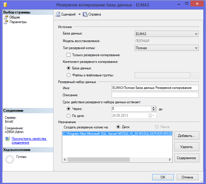 Откроется диалоговое окно Резервное копирование базы данных. Заполните необходимые поля. Резервная копия базы данных при этом будет иметь расширение .bak. В разделе Параметры (левого меню можно сжать резервную копию БД при установке флажка Сжимать резервные копии.