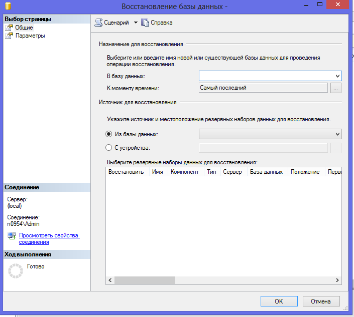Операция восстановления может быть выполнена несколькими способами, рассмотрим вариант резервного копирования в среде SQLManagementStudio. Для этого необходимо выбрать пункт Базы данных и в контекстном меню выбрать пункт Задачи, далее выбрать команду Восстановить базу данных. Откроется диалоговое окно Восстановление базы данных. Заполните необходимые данные.