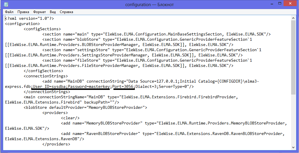 Для версии ELMA:Экспресс можно изменять порт подключения к СУБД, а также учетные данные. Это можно осуществить в конфигурационном файле в папке UserConfig: