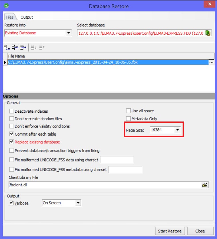 Рассмотрим процедуру восстановления в IBExpert: для этого в контекстном меню Services выберите пункт RestoreDatabase. Появится диалоговое окно DatabaseRestore. В закладке Files уже установлены все необходимые значения. В поле Restore into указано Existing database.