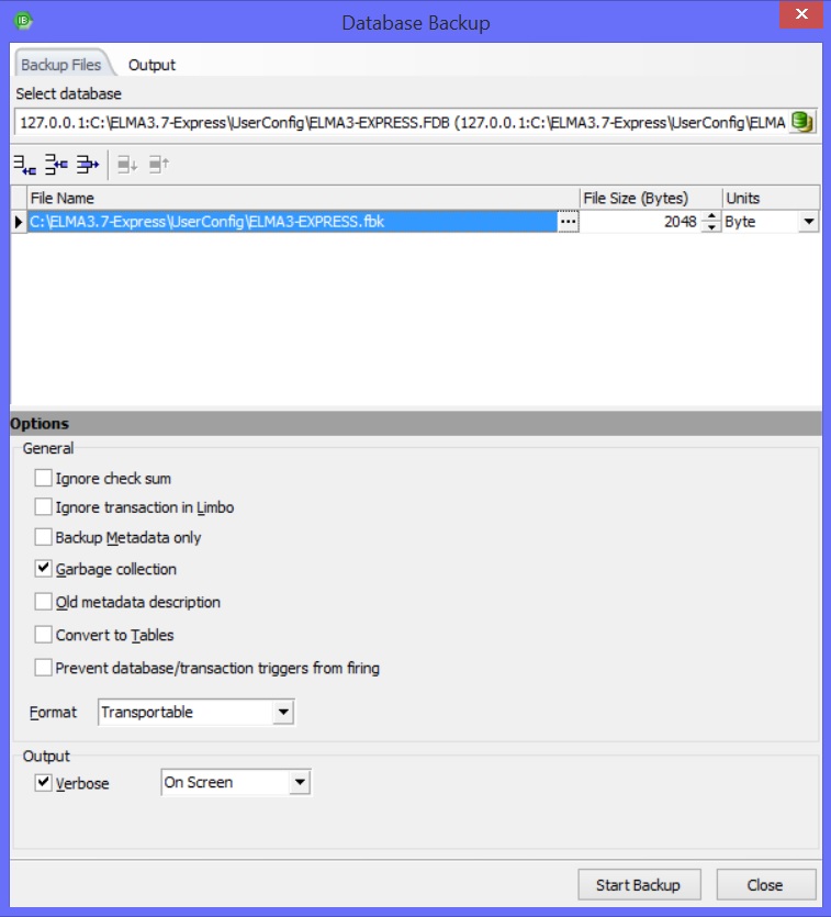 Рассмотрим бэкап в IBExpert: в меню Services выберите BackupDatabase. Появится окно Database Backup, в котором в закладке Backup Files уже установлены некоторые необходимые значения. Вы можете изменить имя файла копии и его размер. Как мы видим, резервная копия базы данных Firebird будет иметь расширение .fbk.