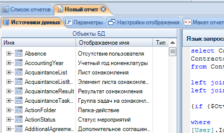 В Дизайнере в разделе Отчеты создаем Новый отчет, который будет выводить информацию о контрагентах, отрасль и ответственных за контрагентов. Используем справочники Контрагенты, Пользователи, Отрасль. Данные объекты можно найти на вкладке Источники данных отчета, в правой части окна – Объекты БД. В Объектах БД можно найти нужный справочник по полю Отображаемое имя, затем посмотреть имя таблицы в БД по полю Имя.