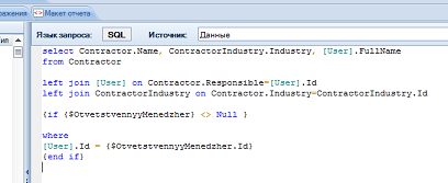 left join [User] on Contractor.Responsible=[User].Id – соединяем таблицу User с таблицей Contractor через поле Responsible (Ответственный) из таблицы Contractor с полем Id из таблицы User. Это необходимо, чтобы в результате отчета в выводимом поле Ответственный было полное имя сотрудника, не его ID.