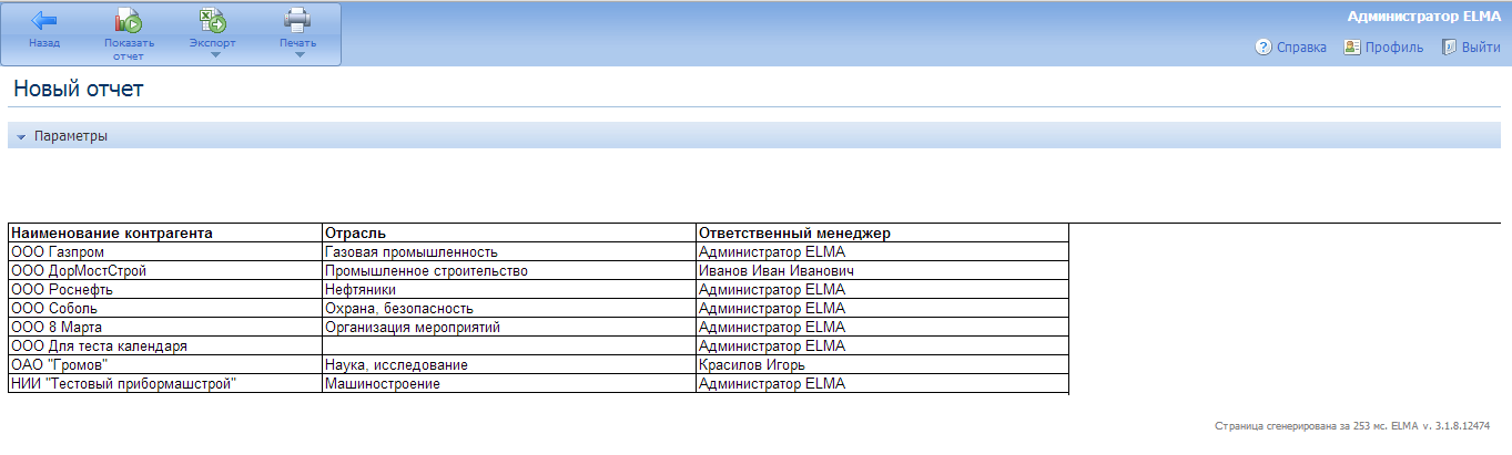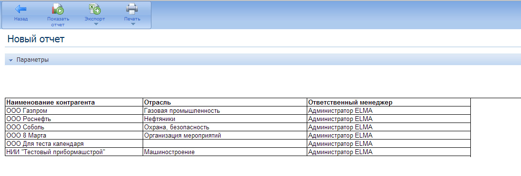 В результате выведены те контрагенты, у которых ответственным менеджером назначен Администратор ELMA.