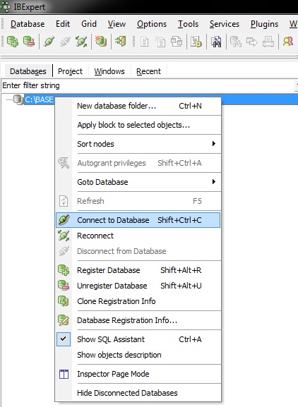 После того, как база данных была зарегистрирована, к ней необходимо подключиться. Для этого в списке баз данных дважды нажмите левой кнопкой мыши по нужной базе данных, либо нажатием правой кнопки мыши по базе вызовите контекстное меню и выберите в нем пункт Connect to Database (рис. 2).