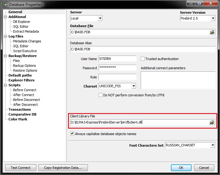 - путь до базы (Database File) – путь до файла base.fdb (рис. 1.4);