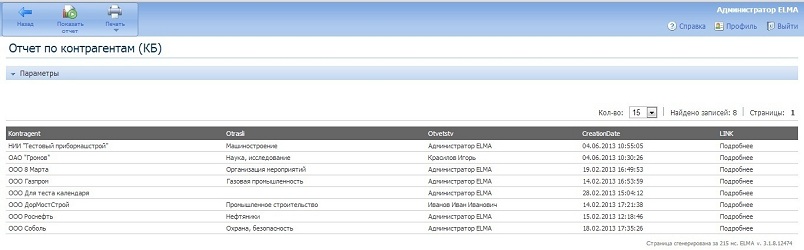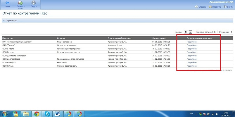 При нажатии на ссылку Подробнее откроется подотчет "Запланированные действия" в новой вкладке (на примере выведены "Запланированные действия" для контрагента с именем ООО "Газпром"):