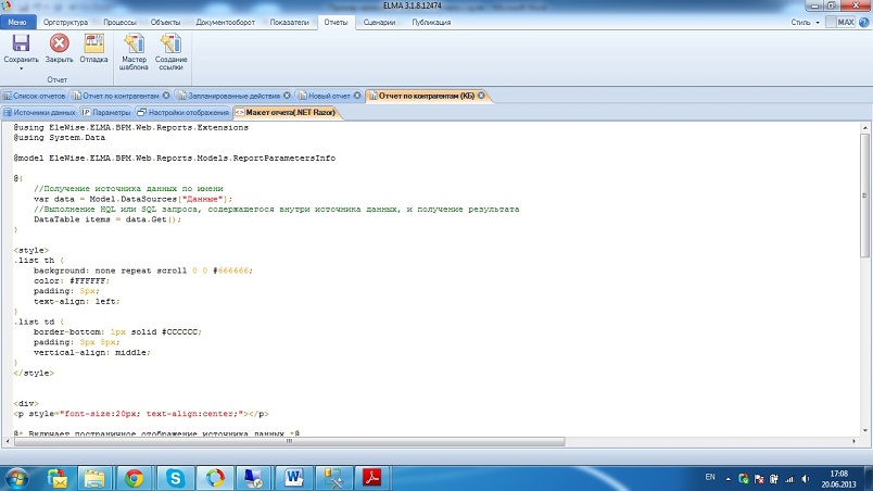 Переходим на вкладку Макет, где рисуем отображение отчета на .NETRazor в веб-части. Здесь можно написать код для отображения результирующих данных на языке HTML, либо использовать Мастер шаблона.