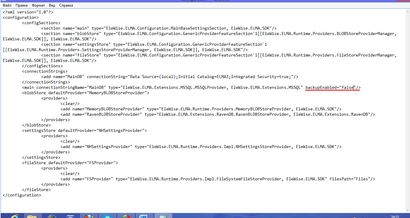 Для того, чтобы отключить резервное копирование БД при старте сервера ELMA, необходимо внести изменения в конфигурационном файле configuration.config.