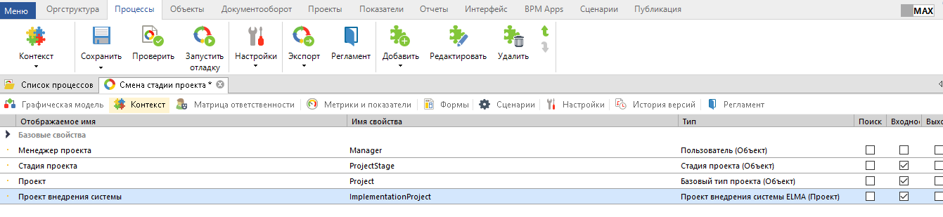 Далее на вкладке Контекст необходимо добавить контекстные переменные типа: Стадия проекта (Объект), Проект внедрения системы (Проект) и Базовый тип проекта (Объект). Для перечисленных переменных необходимо установить флаг Входное (Рис. 7). Эти переменные будут использоваться для указания процесса при изменении перехода между стадиями проекта в Дизайнере ELMA в карточке требуемого типа проекта на вкладке Жизненный цикл.