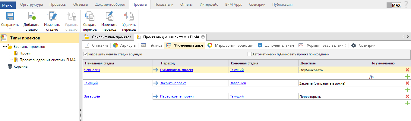 Рис. 8. Редактирование типа проекта в Дизайнере ELMA, вкладка "Жизненный цикл"