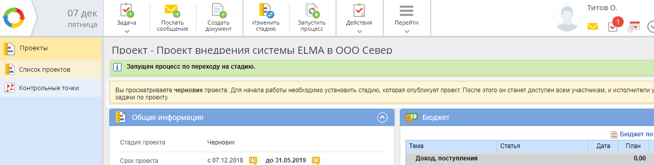 При этом на странице проекта будет отображено уведомление о запуске процесса по переходу на следующую стадию (Рис. 10).