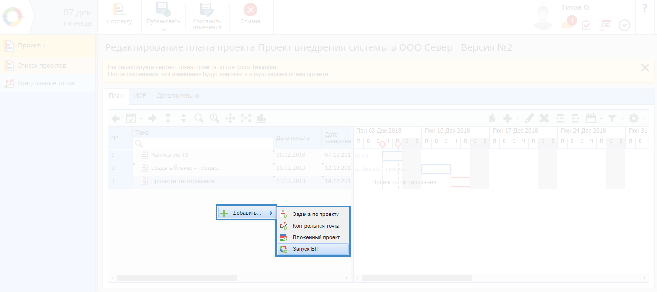 Для того чтобы создать задачу запуска бизнес-процесса в плане проекта, необходимо открыть план проекта, нажать в верхнем меню кнопку Редактировать и правым щелчком мыши нажать на рабочее поле плана проекта (Рис. 1). В контекстном меню следует выбрать пункт Добавить – Запуск БП.
