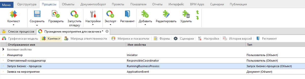 Рис. 7. Контекстные переменные процесса "Добавление пакета документов"