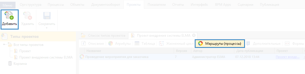 Далее в нужном типе проекта следует перейти на вкладку Маршруты (процессы) и добавить данный процесс в список маршрутов (Рис. 4):